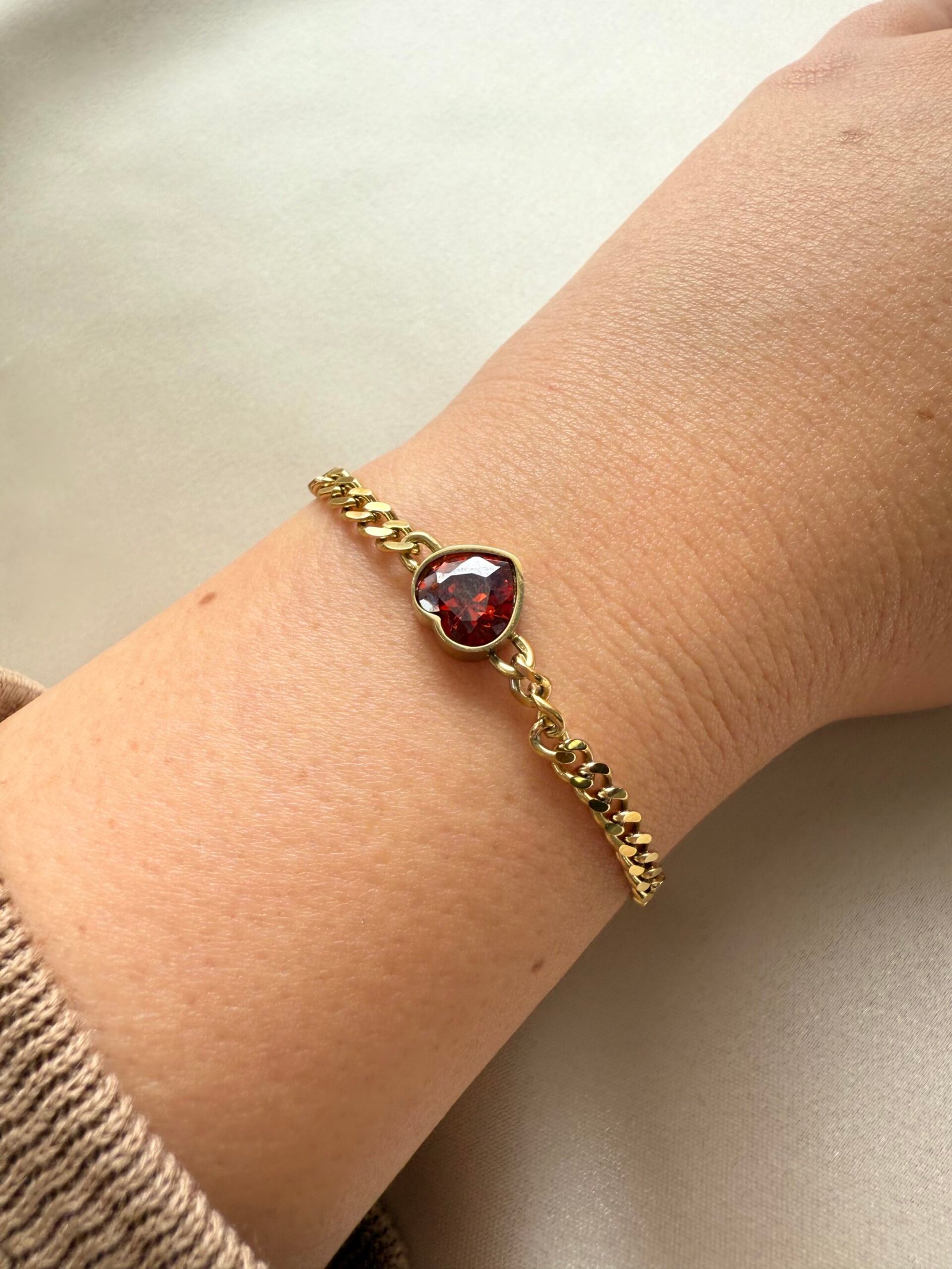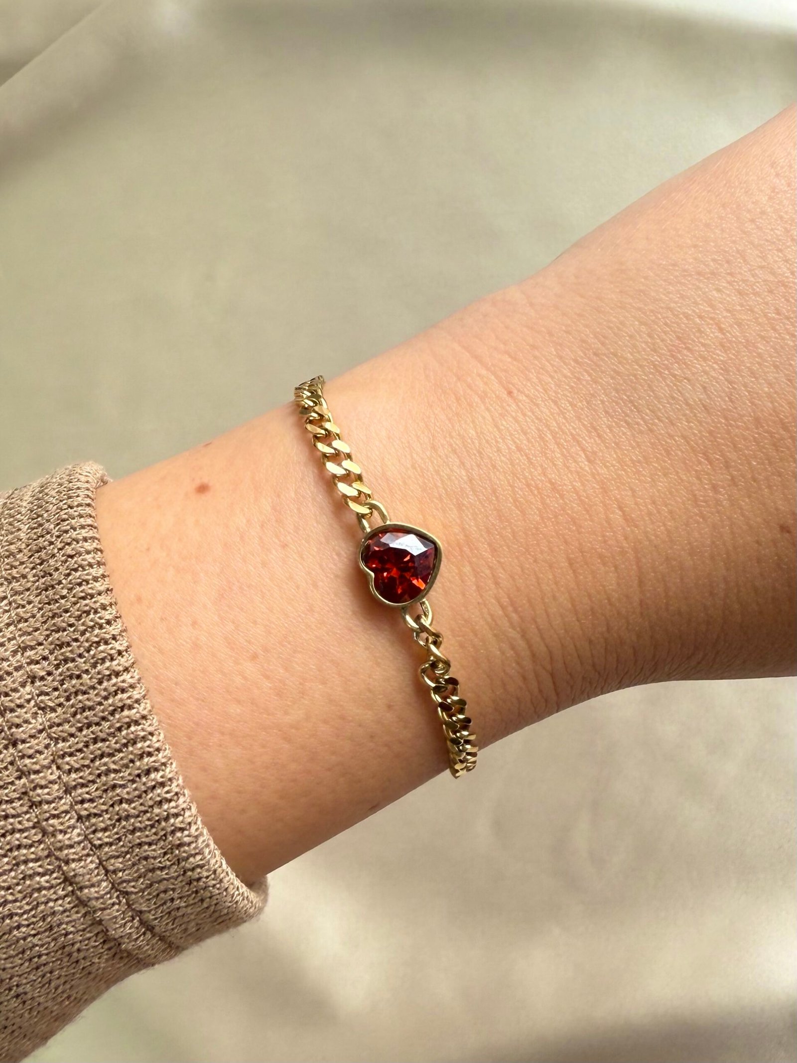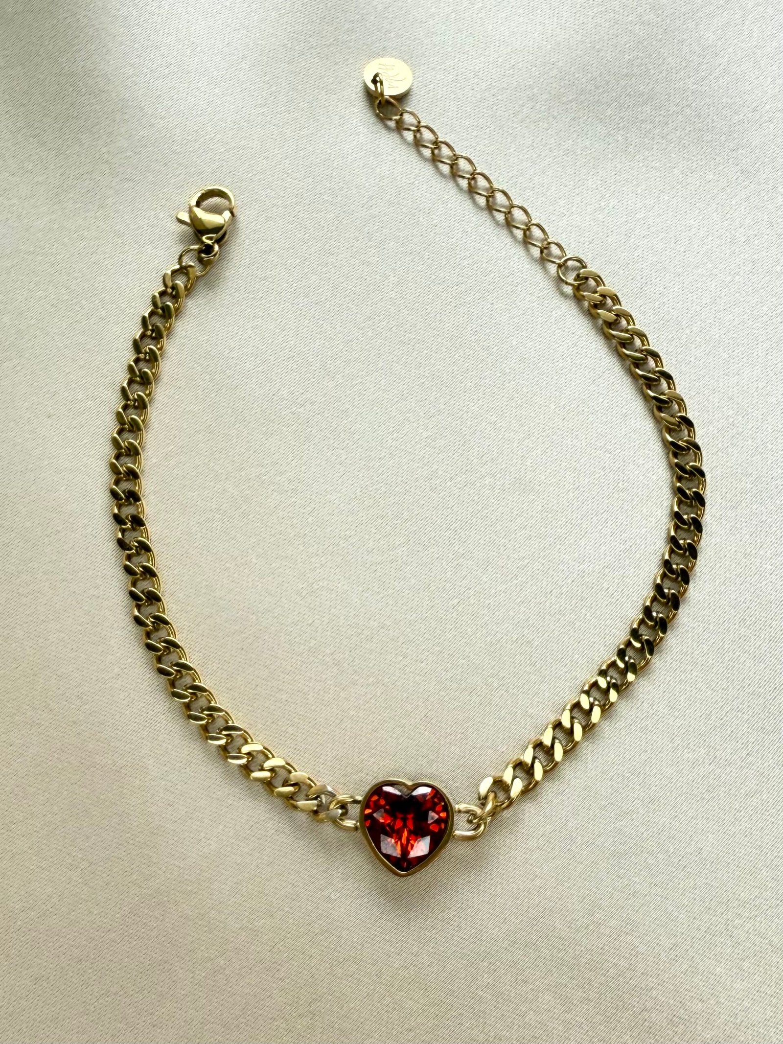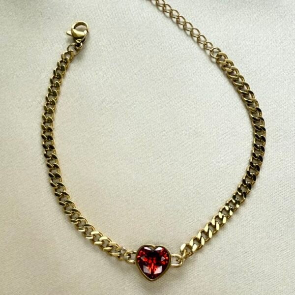Unesi dašak romantike u svoj stil s ovom prekrasnom narukvicom u pozlaćenom nehrđajućem čeliku. Na sredini se ističe jedno srce ukrašeno cirkonom u crvenoj boji, dok su s obje strane spojene alkice koje narukvici daju elegantan i čvrst izgled. Savršeno se uklapa uz dnevne i večernje kombinacije, a zahvaljujući jednostavnom dizajnu, lako ju je kombinirati i s drugim nakitom.