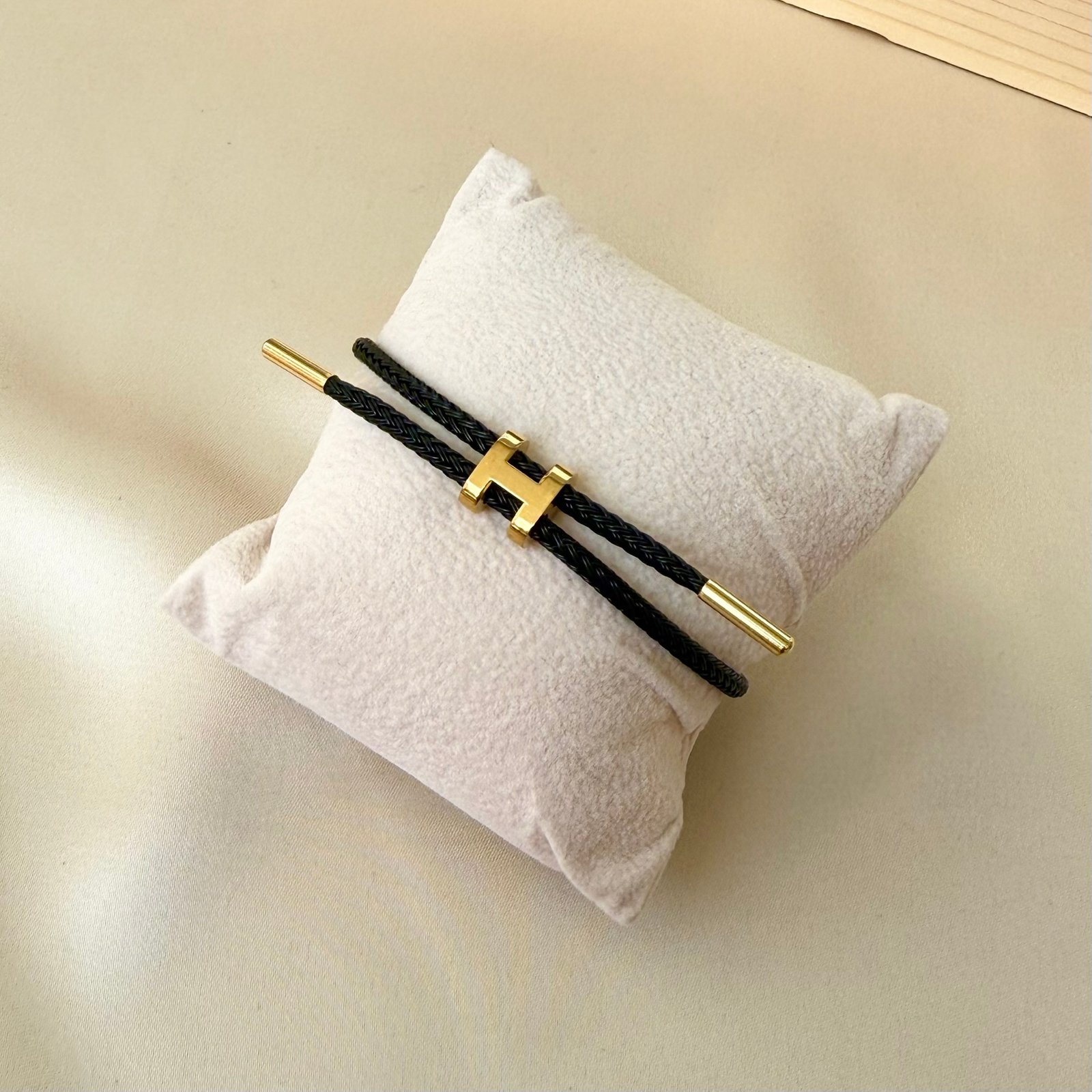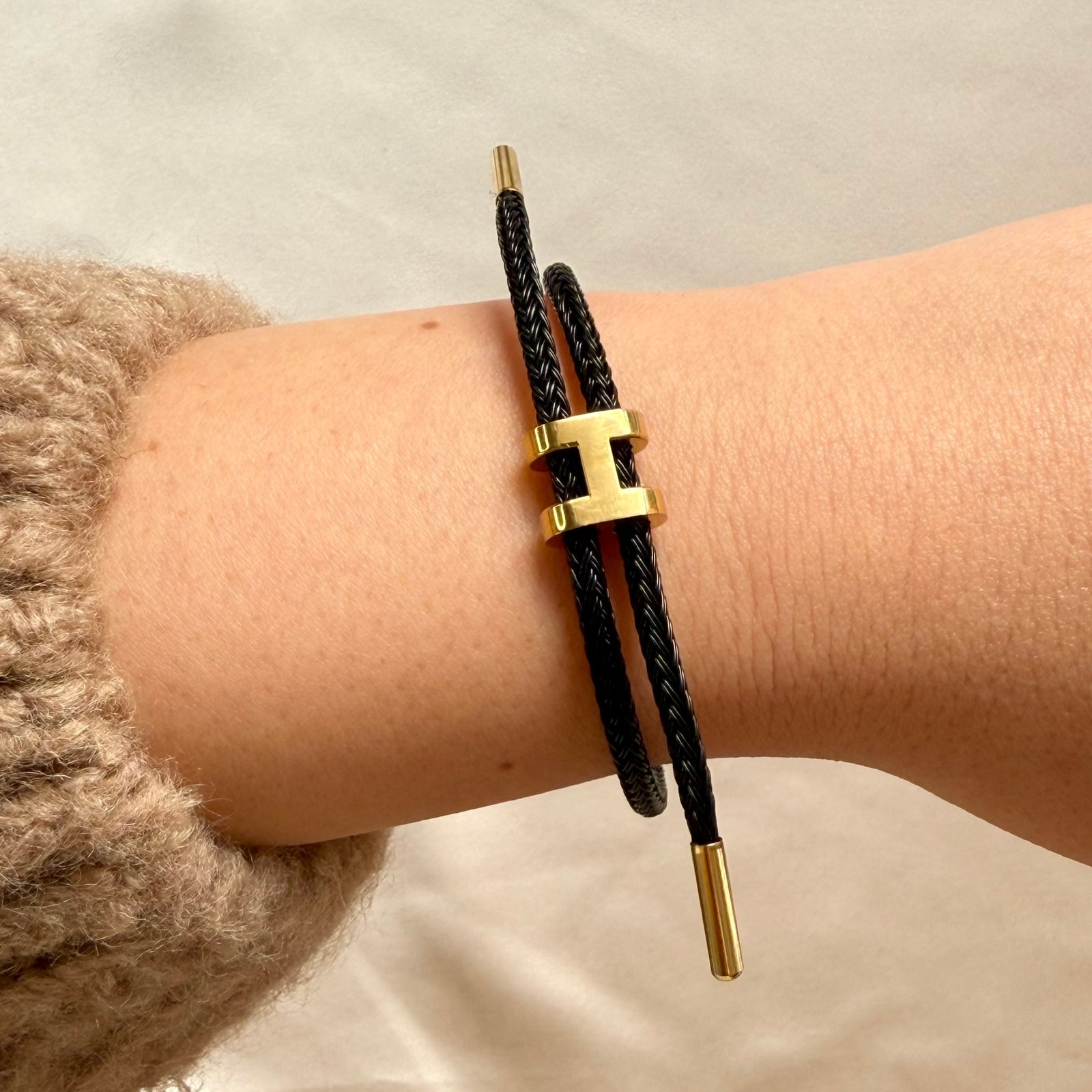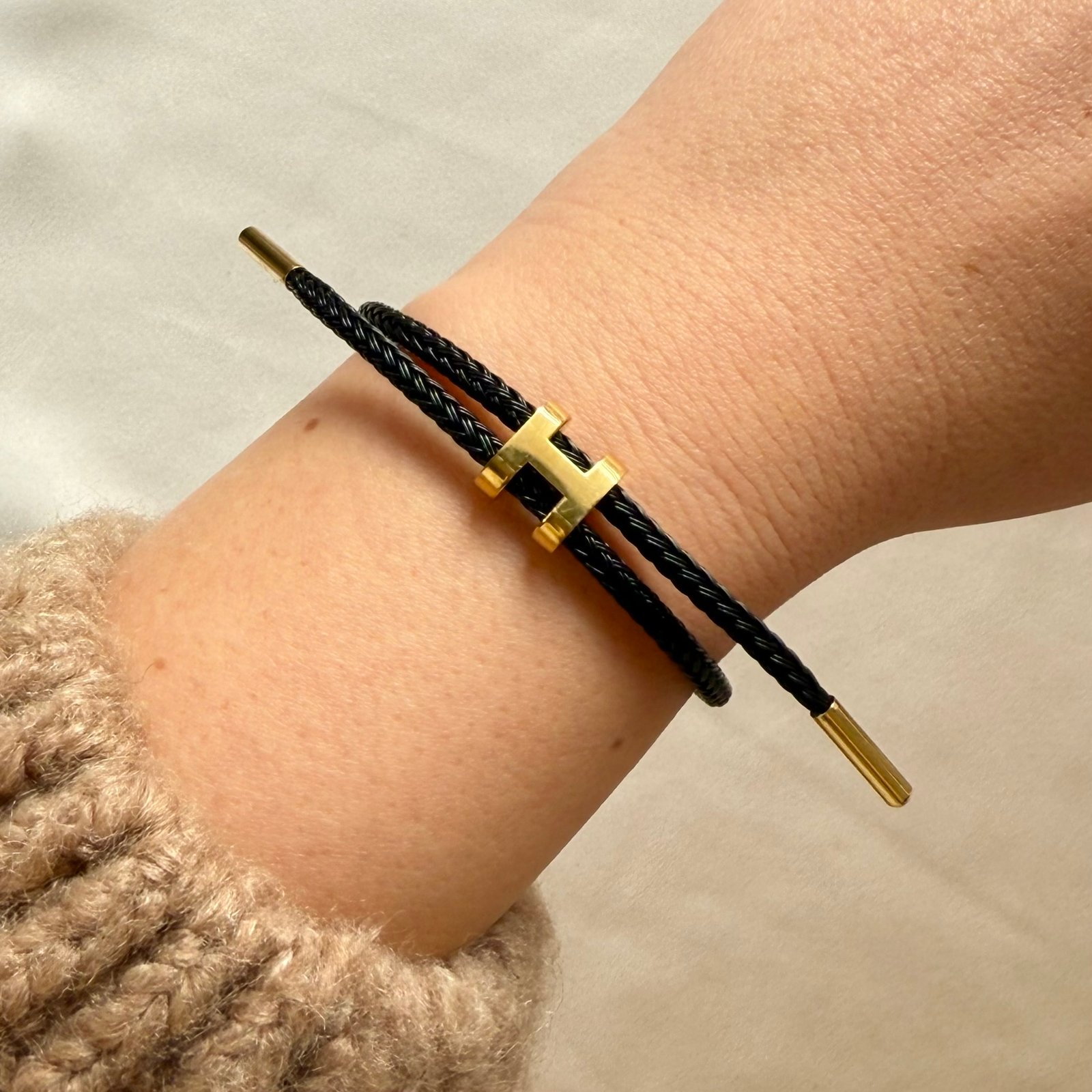 Moderan i prepoznatljiv dizajn – narukvica H u crnoj boji kombinira pletenu traku od čvrstog materijala i detalj od nehrđajućeg čelika s pozlatom u obliku slova H. Lagana, udobna i prilagodljiva, savršeno pristaje uz svaki stil.