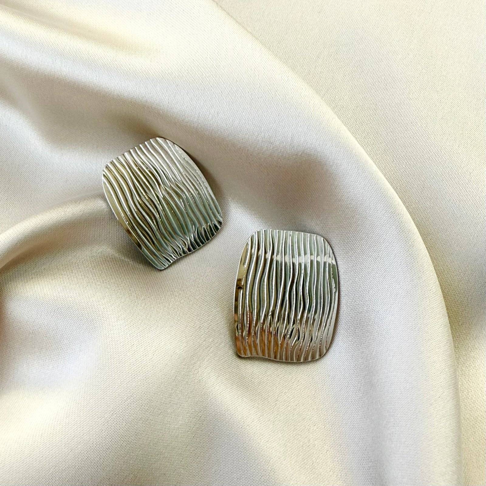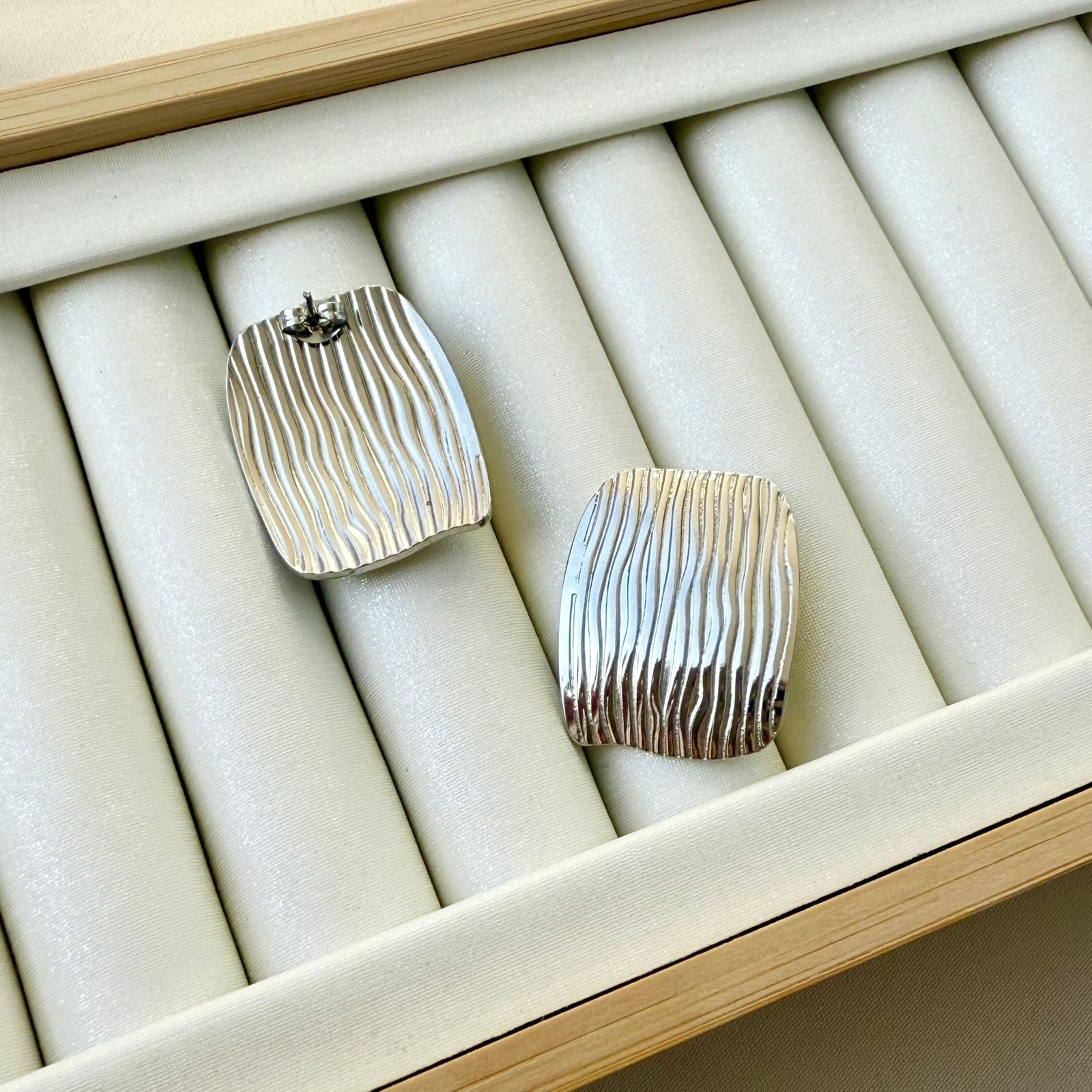 Reljefne naušnice u srebrnoj boji ističu se pravokutnim oblikom i bogatom teksturom koja dodaje dubinu svakom izgledu. Pločasta forma s izraženim uzorkom čini ih posebnima, a njihov moderan sjaj pruža dojam čistoće i elegancije.